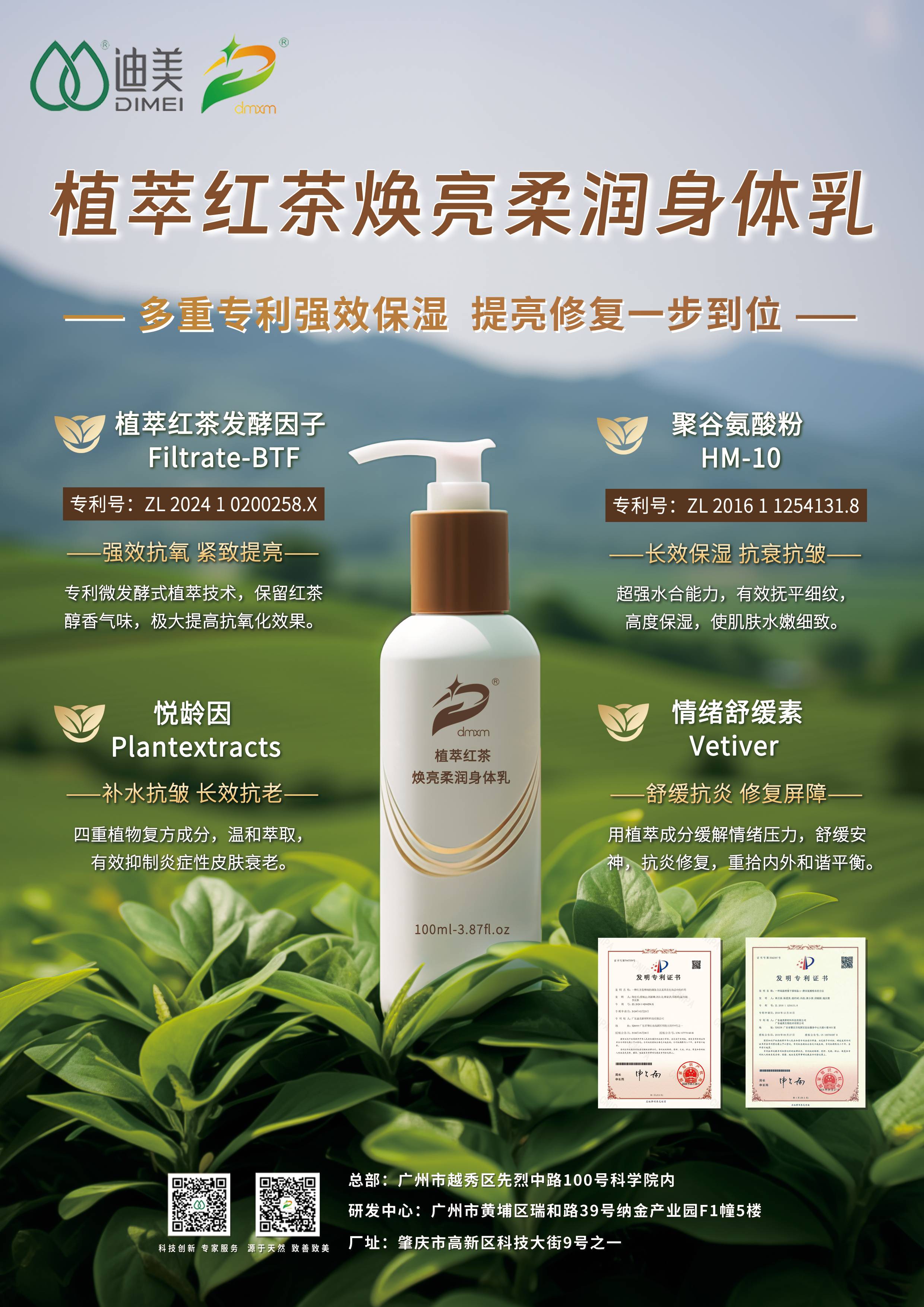 廣東省科學(xué)院微生物研究所微生物工程研究發(fā)展中心謝小保主任 6月29日,為賦能行業(yè)實(shí)現(xiàn)高質(zhì)量發(fā)展,聚焦化妝品安全評(píng)估、功效評(píng)價(jià)、合規(guī)宣稱等議題特設(shè)“化妝品安全與功效技術(shù)論壇”,本次論壇由廣東省科學(xué)院微生物研究所承辦。 廣東迪美技術(shù)經(jīng)理陳偉階在本次論壇中參與分享了化妝品用發(fā)酵原料的功效及作用機(jī)理的主題報(bào)告,本次報(bào)告圍繞化妝品發(fā)酵原料達(dá)到維穩(wěn)抗氧、抗炎舒緩、平衡皮膚微生態(tài)等功效的作用機(jī)理及功效驗(yàn)證方法。 02 植萃紅茶發(fā)酵因子 Filtrate-BTF 在廣東省化妝品科學(xué)技術(shù)“金穗獎(jiǎng)”評(píng)選中,廣東迪美植萃紅茶發(fā)酵因子Filtrate-BTF獲得優(yōu)秀創(chuàng)新原料獎(jiǎng),該產(chǎn)品運(yùn)用獨(dú)創(chuàng)的“微發(fā)酵式植萃”技術(shù),有效提取天然紅茶所含的活性物質(zhì)的創(chuàng)新點(diǎn),具有抗氧化、抗衰老、抗光損傷能力的效果。 植萃紅茶煥亮柔潤(rùn)身體乳以英德紅茶為核心成分,自帶紅茶獨(dú)特醇香,富含多重抗氧化物質(zhì),通過迪美專利技術(shù),最大化保留活性物質(zhì),增強(qiáng)抗衰老功效。 結(jié)合迪美聚谷氨酸專利提取技術(shù),刺激活化細(xì)胞,促進(jìn)皮膚內(nèi)天然保濕因子(NMF)的生長(zhǎng),機(jī)能型長(zhǎng)效保濕,增進(jìn)皮膚彈性與柔軟度。